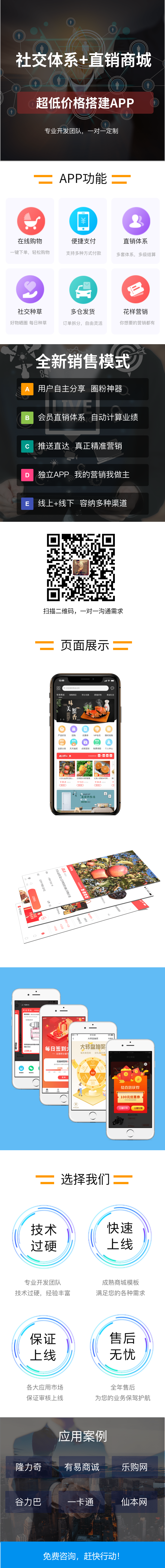 本产品是为新时代下电商客户量身定做的,集线上销售,社交裂变,分销管理,营销活动,在线客服,库存管理,财务统计等功能于一体的社交分享购物平台。