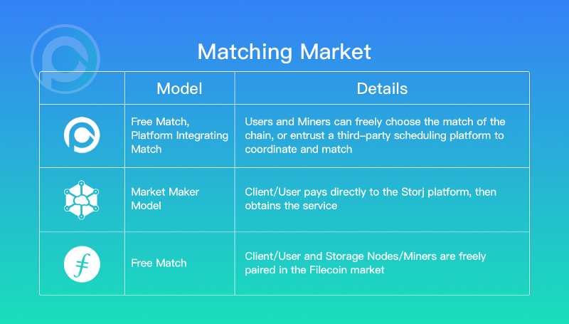 - Filecoin 则采用了撮合模式,所有的服务需求方(Client / User)和服务提供方(Storage Node / Miner)在 Filecoin 的市场(包括存储市场和检索市场)上自由配对交易,是一种完全去中心化的模式。