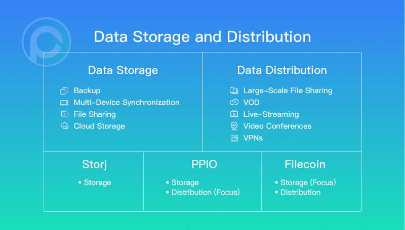 - PPIO 和 Filecoin 一样,同时兼顾存储和分发,但更重点关注的是分发场景。PPIO 很快会在应用层增加流媒体输出能力,支持主流的点播和直播方案。