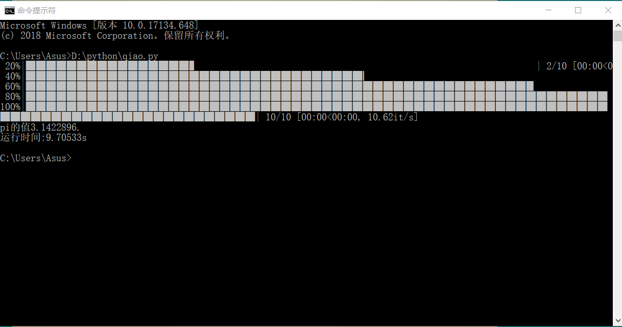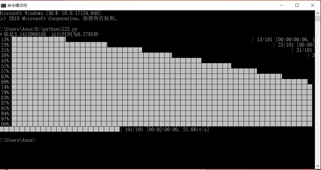 今天老师布置了一个课后作业,去尽可能的准确计算π的值,还要显示时间和进度条,对于python小白的我,当然是综合书上和网上的知识,自己做了一个小程序,代码如下: