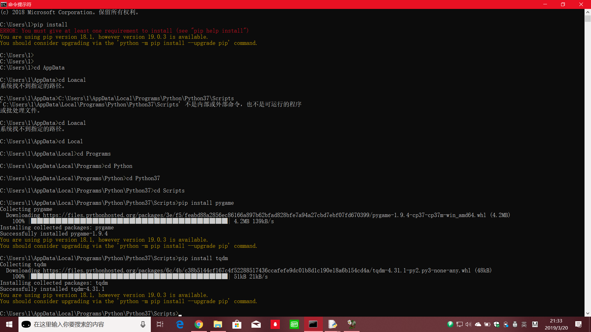 步骤2:输入pip install 你要安装的库(如 pip install tqdm) #pip一般是在安装python的时候就有了,但是我还没有tqdm库,所以就要去下载