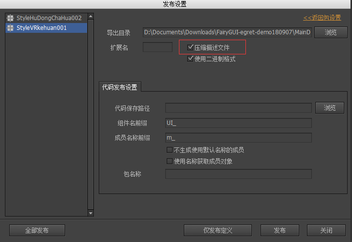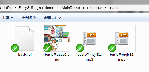 4.使用FairyGUI编辑器完成UI编辑。发布目录请选择Egret工程的resource/assets目录。发布后得到两个(或以上)文件。