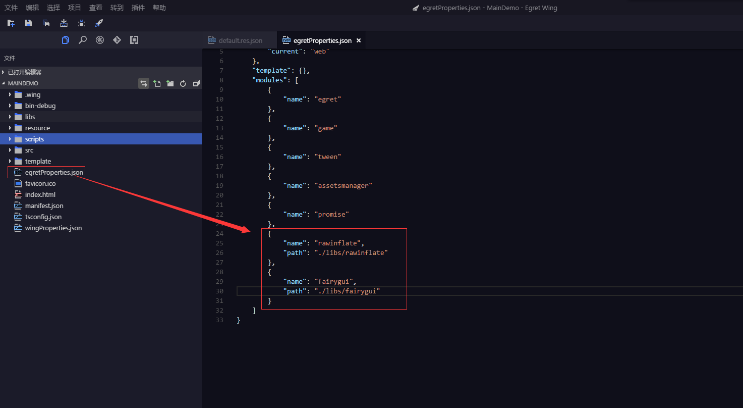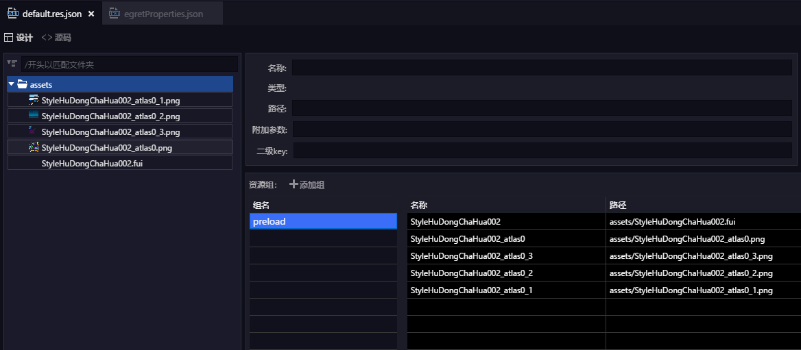 5. 在default.res.json里,将上述的文件添加到定义中。扩展名为fui文件,类型请选择为bin。注意:Egret自动检测添加的资源,名称通常会自动加上下划线和后缀,例如basic.fui,名称自动设置为“basic_fui”,这里我们要手动将_fui去掉,名称只需要为“basic”