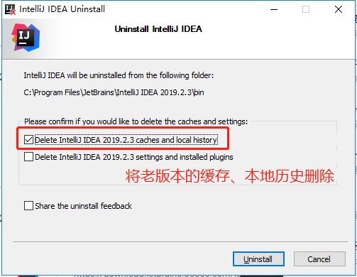 这里笔者机器上,之前是安装过 IDEA 2019.2.3 版本的,所以提示是否删除老版本,这里我们选择删除老版本: