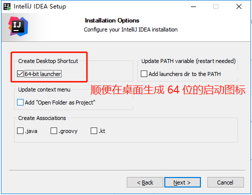 继续点击下一步,这里笔者的电脑是 64 位的,顺便将 64 位的 IDEA 启动图标生成到桌面上: