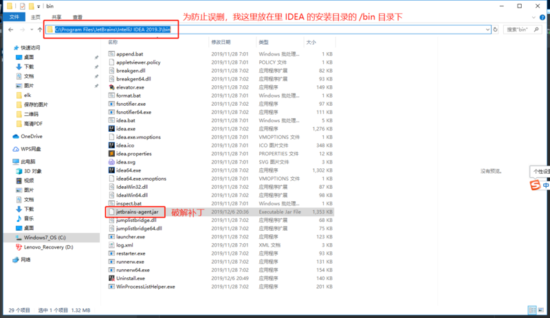 下载破解补丁成功以后,笔者将它放置在了 IDEA 的安装目录 /bin 路径下,以防止后面被自己误删: