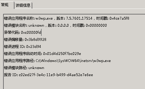 虽然不能看到更多信息,但是通过搜索异常代码: 0xc00000fd基本上可以判断是内存泄漏导致的应用程序池崩溃。