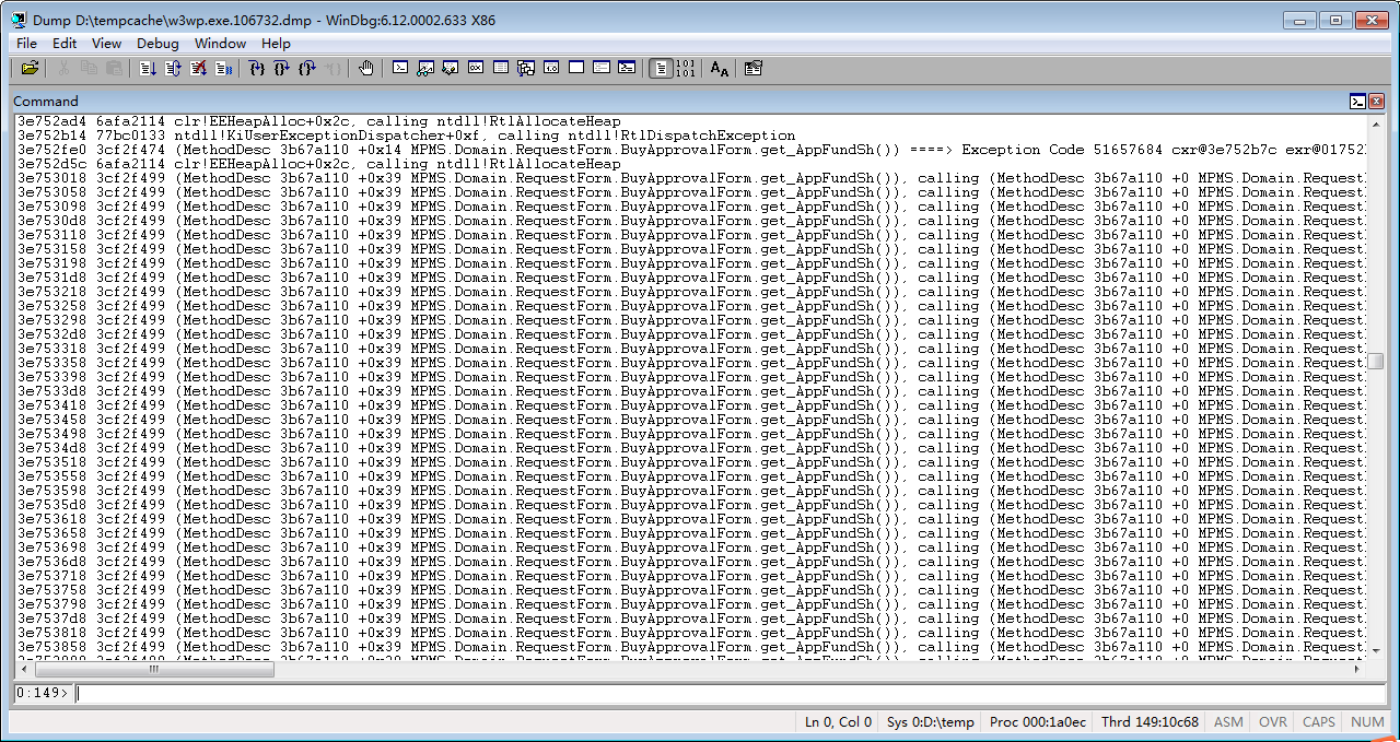 这个时候我已经被带偏了,我应该亲自看一下这个代码,亲自调试一下看看的。不断的敲着windbg的命名,查看各种对象的内存使用情况,分析一遍又一遍的重复堆栈信息。虽然我不认为是字段映射匹配的问题,但一定是哪个地方的逻辑循环调用导致这个问题的发生。