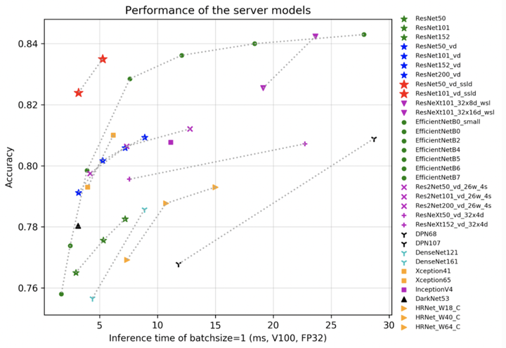 先说服务器端的预训练模型,如图 3 所示,图中记录了在 V100,FP32 和 TensorRT 环境下一些最新的面向服务器端应用场景的模型的效果和性能对比图,通过该图用户可以直观的快速选择出需要的网络结构。