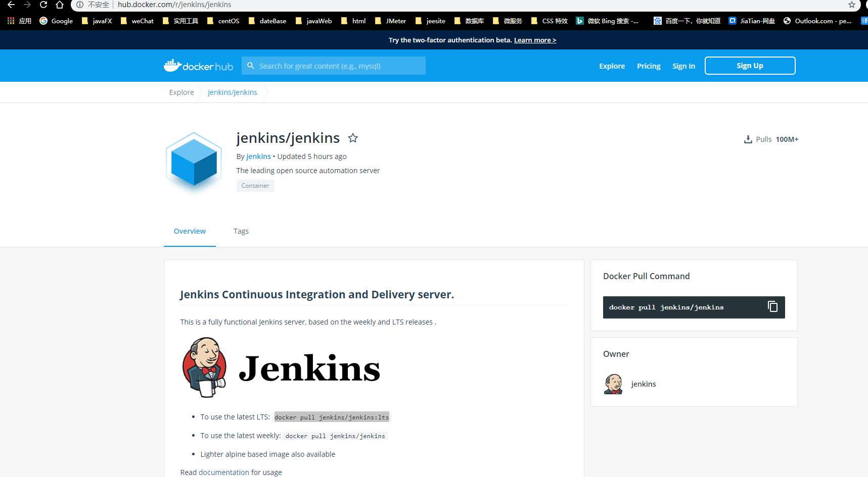 在镜像文档里,我们知道Jenkins访问的端口号是8080,另外还需要暴露一个tcp的端口号50000。我们使用如下命令启动Jenkins镜像。