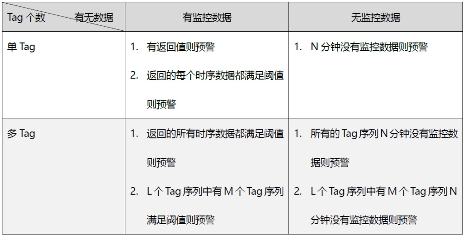 每一条时序数据曲线,都是对一个Tag的描述,因此依据Tag的数量以及数据的有无,可以将校验规则进行如下分类: