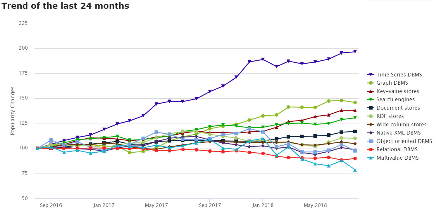 随着移动互联网、工业互联网、物联网、边缘计算的兴起及发展,时序数据最近两年呈爆发式增长,根据DB-Engines公布的权威数据,可以发现在各种类型数据库发展趋势中,时序数据库的发展势头异常强劲。