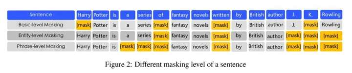在第三阶段命名实体,如:人名,机构名,商品名等,在这个阶段被mask掉,模型在训练完成后,也就学习到了这些实体的信息。