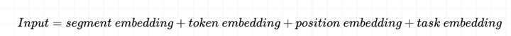 模型的结构和BERT一致,但是在预训练的阶段,除了正常的position embedding,segment embdding,token embedding还增加了「task embedding」。用来区别训练的任务, 对于N个任务,task的id就是从0~N-1,每个id都会被映射到不同的embedding上。模型的输入就是: