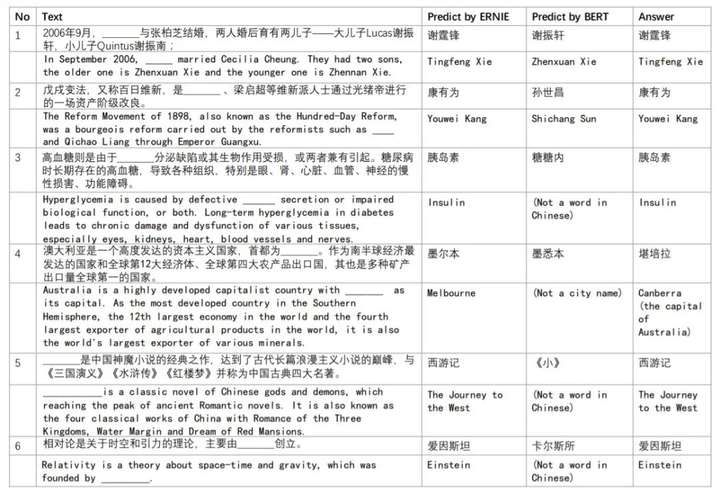 需要注意的是这些知识的学习是在训练中隐性地学习,而不是直接将外部知识的embedding加入到模型结构中(ERNIE-TsingHua[4]的做法),模型在训练中学习到了更长的语义联系,例如说实体类别,实体关系等,这些都使得模型可以学习到更好的语言表达。