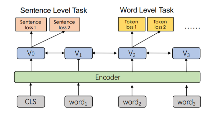 「Inituition」:就像是我们学习一个新语言的时候,我们需要很多之前的知识,在这些知识的基础上,我们可以更快地学习新语言,如此就有了迁移学习的效果。我们的语言模型如果增加多个任务的话,是不是可以获得更好的效果?事实上,经发现,ERNIE 1.0 加了DLM任务以及其他的模型。如Albert 加了sentence order prediction(SOP)任务之后或者SpanBERT: Improving Pre-training by Representing and Predicting Spans[6]在加上了SBO目标之后 ,模型效果得到了进一步的优化,同时MT-DNN[7]也证明了,在预训练的阶段中加入多个GLUE下游任务(有监督)进行多任务学习,可以得到state-of-the-art的效果。