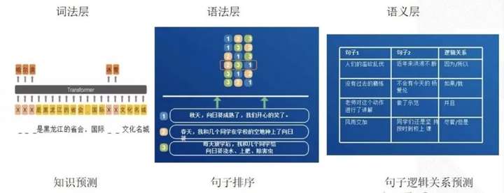 - 语义层级的任务(semantic-aware pretraining task) :获取语义关系的知识