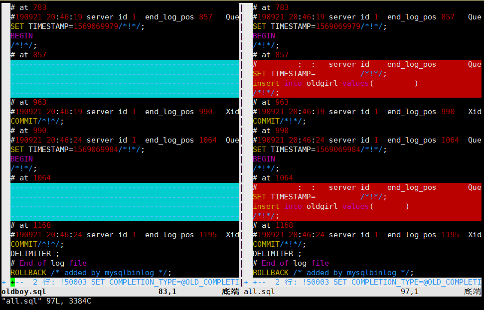 [root@localhost data]# vimdiff oldboy.sql all.sql