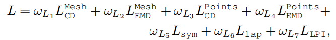 mesh的两项为形状损失,包含了CD(chamfer )和EMD(earth mover)两项,来确定变型后的模型与目标模型的外形。point的两项用于保持对称性,所以要通过点云来比较。为了避免自交叉引入了局域变异不变性损失,保持源形状的局域几何特性拉普拉斯损失。