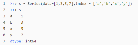 Series 对象的元素会严格依照给出的 index 构建,这意味着:如果 data 参数是有键值对的,那么只有 index 中含有的键会被使用;以及如果 data 中缺少响应的键,即使给出 NaN 值,这个键也会被添加。