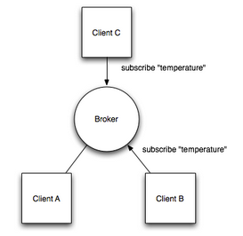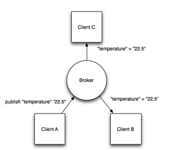MQTT协议的架构,用一个示例说明。比如有1个温度传感器(1个Machine),2个小的显示屏(2个Machine),显示屏要显示温度传感器的温度值。