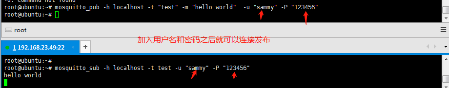 mosquitto_pub -h localhost -t "test" -m "hello world" -u "sammy" -P "password"