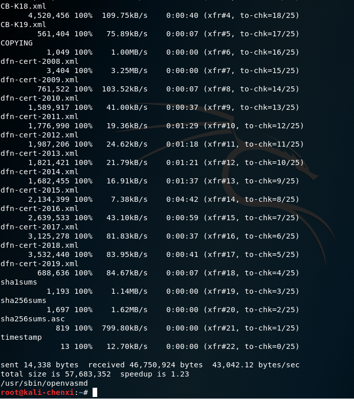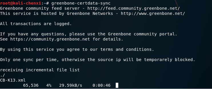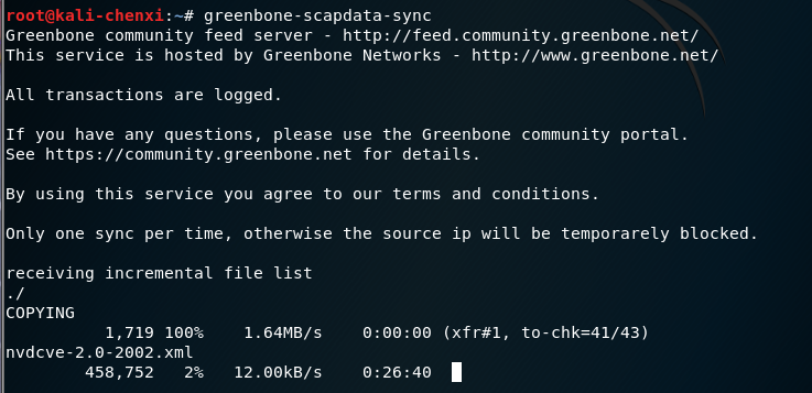- 使用命令'greenbone-scapdata-sync'更新漏洞信息库内容(时间比较久)。