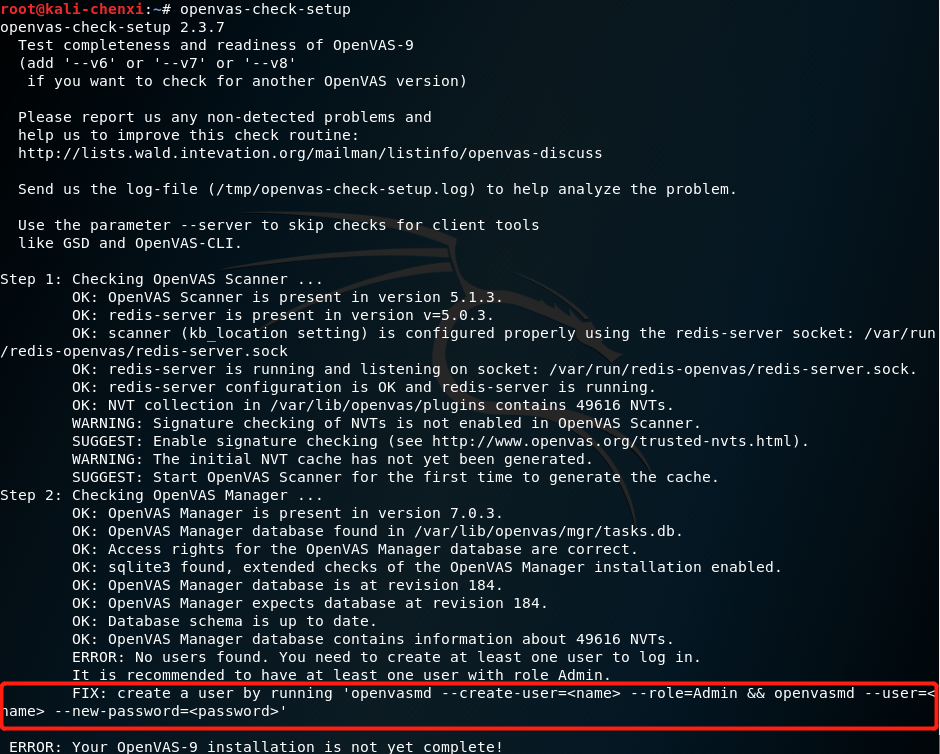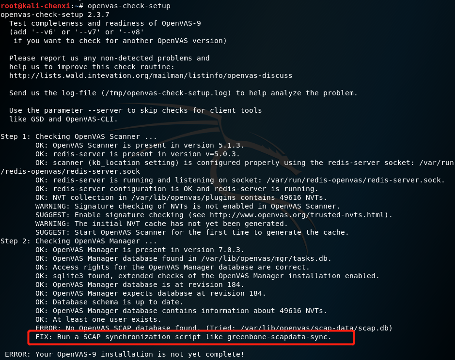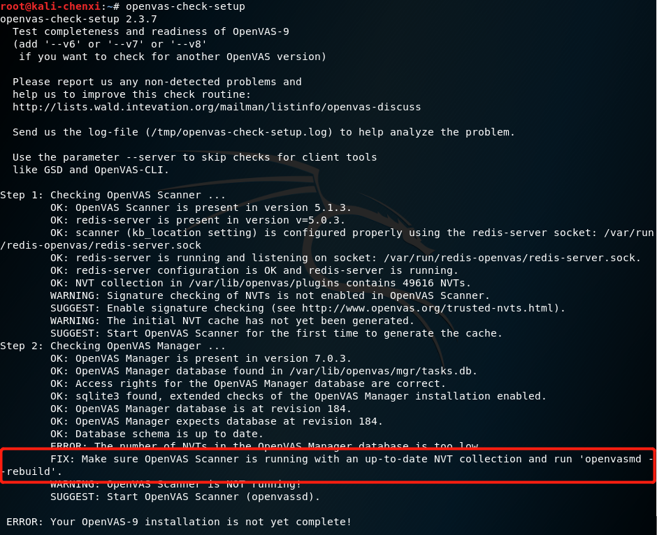 openvas-check-setup。发现提示需要更新漏洞信息库内容。