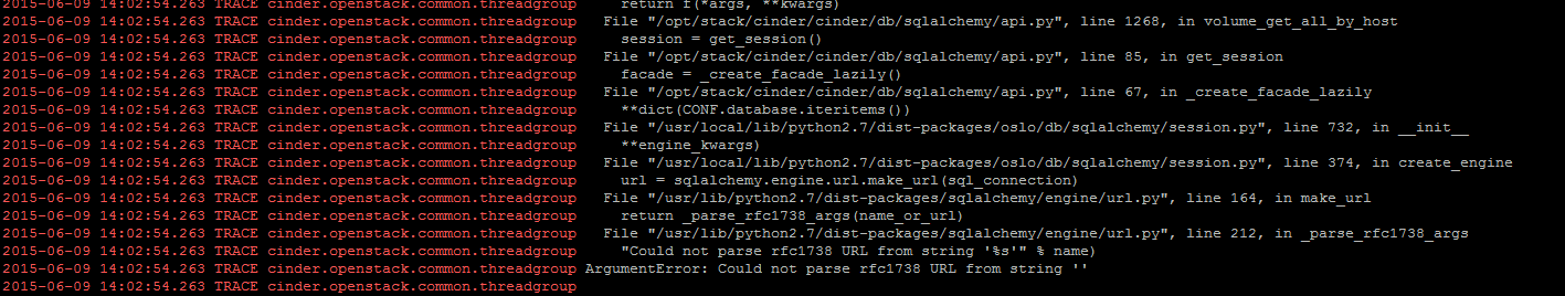 7. Gettting error when rejoin stack:2015-06-09 14:02:33.154 TRACE cinder.openstack.common.threadgroup ArgumentError: Could not parse rfc1738 URL from string ''"