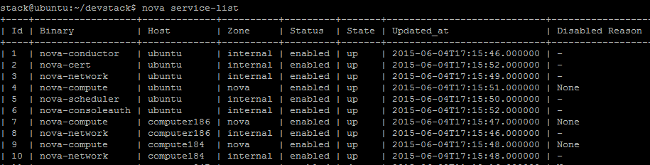HOST_IP=your configured IP address MULTI_HOST=1 FIXED_RANGE=10.0.0.0/24 FIXED_NETWORK_SIZE=256 ADMIN_PASSWORD=123456 MYSQL_PASSWORD=123456 RABBIT_PASSWORD=123456 SERVICE_PASSWORD=123456 SERVICE_TOKEN=123456 SCREEN_LOGDIR=/home/stack/log/screen LOGFILE=/home/stack/log/stack.log LOGDAYS=1 PUBLIC_INTERFACE=eth0 #actual name of your network interface FLAT_INTERFACE=eth0 - Run devstack to install openstack: ./stack.sh