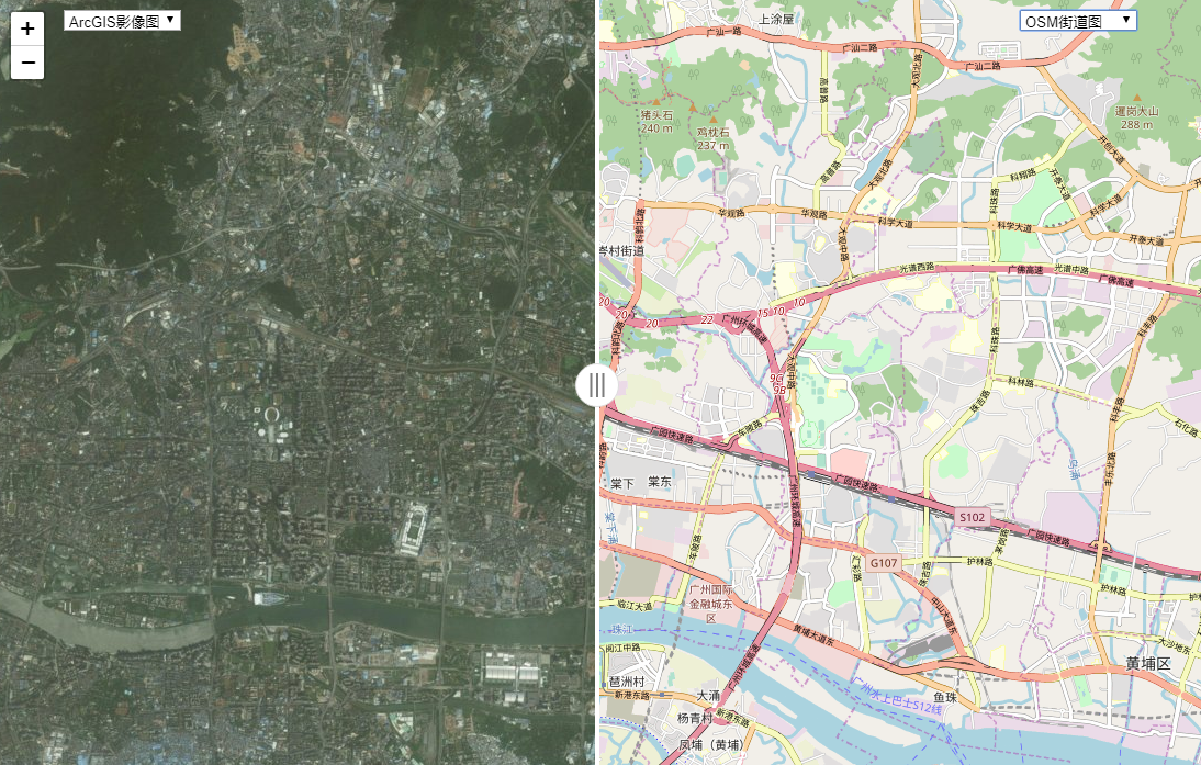 demo 实现的效果比较简单,直接就是用 leaflet 官方的地图卷帘插件 github:leaflet-side-by-side,这个插件用的时候,左右两侧的底图要是同个的话,只能显示一个,不知道这个算不算一个bug