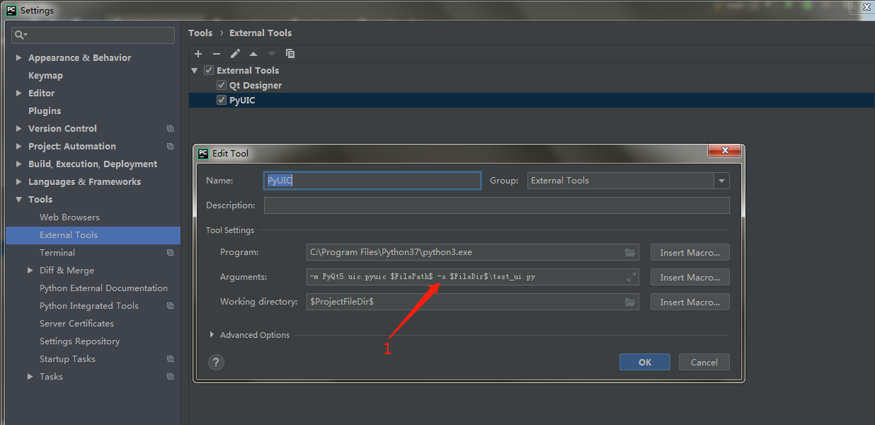 parameters:-m PyQt5.uic.pyuic $FilePath$ -o $FileDir$\test_ui.py(知道在文件路径下安放生成的py文件,命名为test_ui)