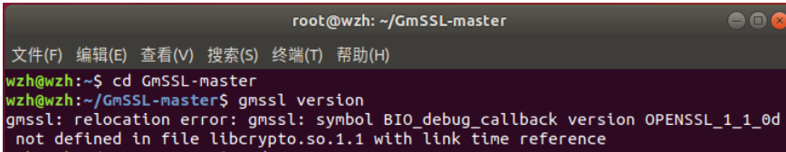 2.错误提示gmssl:relocation error: gmssl: symbol BIO_debug_callback version OPENSSL_1_1_0d not defined in file libcrypto.so.1.1 with link time reference