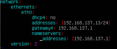 注意点: 1.冒号后面需要有个空格! 2.第一个addresses是地址,/24是子网掩码信息 3.gateway4是网关 4.nameservers下的addresses是DNS地址
