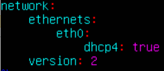 下面介绍两种网卡配置,一种是使用DHCP自动分配IP,一种是使用静态固定IP ###自动分配IP 在ethernets节点下,添加eth0(前面使用ip a看到的网卡名称),子节点dhcp4: true即可:
