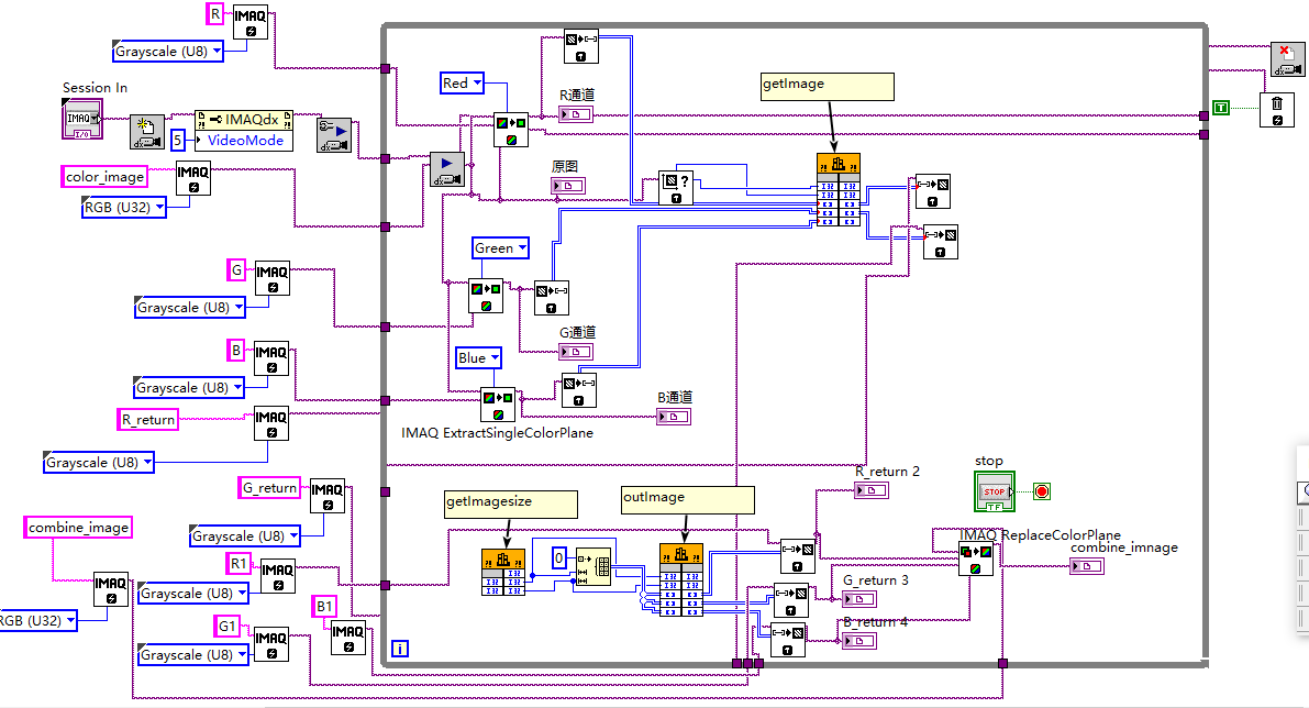 2、opencv里面Mat图像的RGB三个通道顺序是BGR,所以在进行拷贝时要注意顺序,sbgr[0]对应的是B通道,要对应到参数里的imagB指针,最后在labview里接收到的RGB按本来的顺序即可,否则合并后的图像与原图不符。