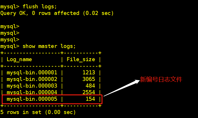 6,Flush logs 刷新日志,此刻开始产生一个新编号的binlog文件,例如: