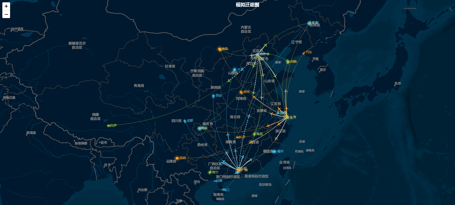 本篇 demo 利用 leaflet api 结合 Echarts4 实现迁徙图功能,效果图如下: