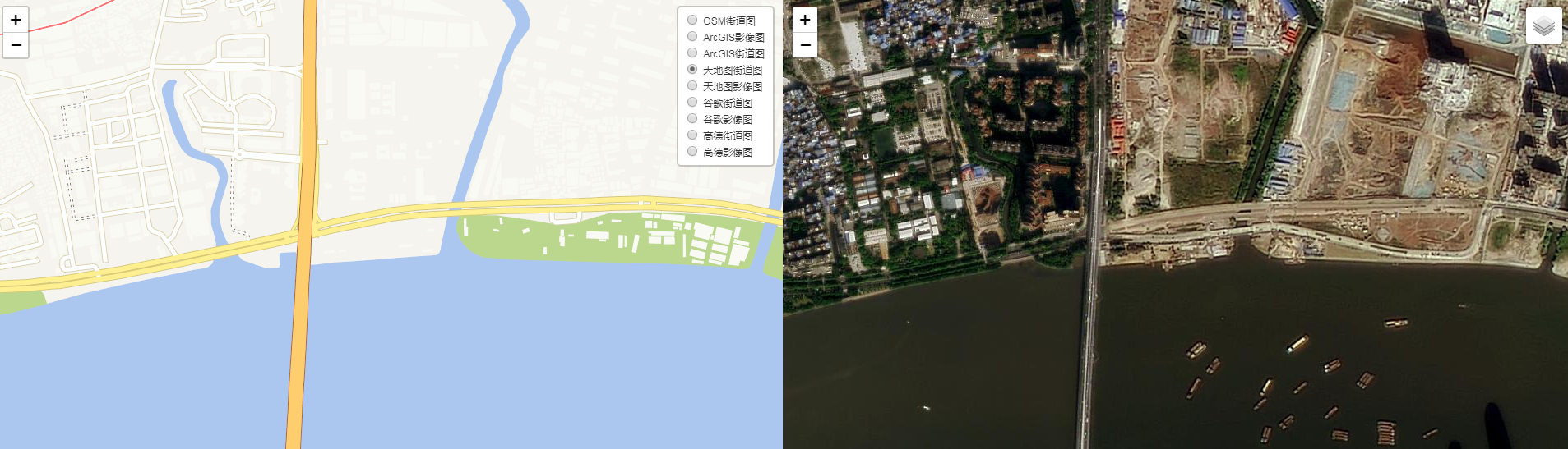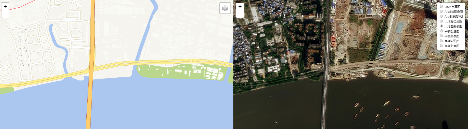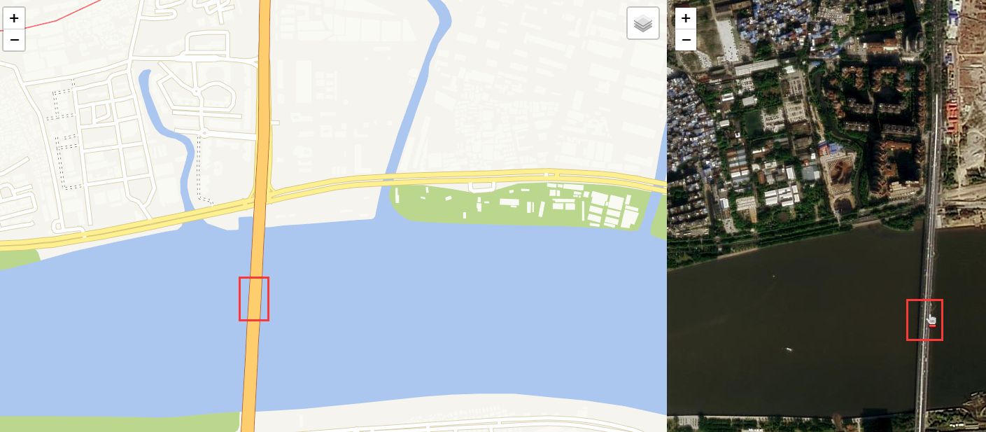 实现思路:创建左右并排的两个 div,各种渲染左右两个不同地图对象,然后同时监听左右两个地图的 drag 以及 mousemove 事件,在事件里面设置两个地图的当前范围一致 map. setView(_this.getCenter(),_this.getZoom());