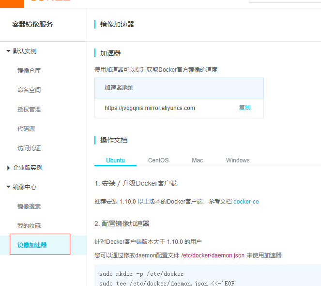 登录阿里云控制台,产品中搜索镜像,选择镜像加速器,复制加速器地址。