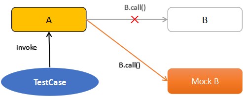 如上图,A 模块依赖于 B 模块,在 B 模块不可达的时候,我们对 依赖接口进行了 Mock。 这样在执行测试时,不需要真实的 B 模块便可完成测试。