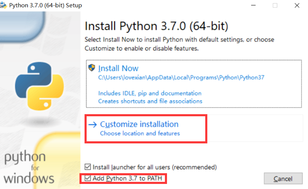 点击Customize installation,勾选Add Python to PATH