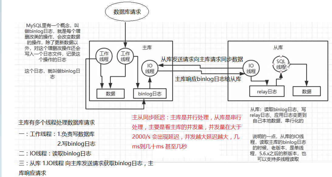 1.MySQL的主从复制都是单线程的操作,主库对所有DDL和DML产生的日志写进binlog,由于binlog是顺序写,所以效率很高。Slave的SQL Thread线程将主库的DDL和DML操作事件在slave中重放。DML和DDL的IO操作是随即的,不是顺序的,成本高很多。