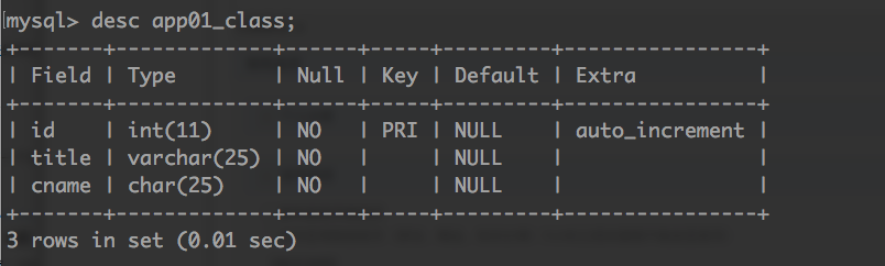 int自增列,必须填入参数 primary_key=True。当model中如果没有自增列,则自动会创建一个列名为id的列。