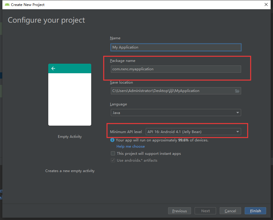 (1)androidstudio新建工程,这一系列没有什么好说的,新建一个空工程,值得注意是下图圈起来的两个地方,packagename==>这个必须要和你的Unity工程的包名一样,