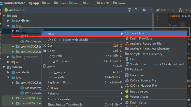 然后右键,new一个javaclass,命名就是WebViewActivity,创建的时候什么都不用管,都是默认就行