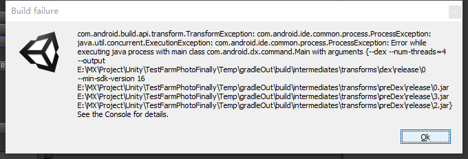 > com.android.build.api.transform.TransformException: com.android.ide.common.process.ProcessException: java.util.concurrent.ExecutionException: com.android.ide.common.process.ProcessException: Error while executing java process with main class com.android.dx.command.Main with arguments {--dex --num-threads=4 --output E:\MX\Project\Unity\TestFarmPhotoFinally\Temp\gradleOut\build\intermediates\transforms\dex\release\0 --min-sdk-version 16 E:\MX\Project\Unity\TestFarmPhotoFinally\Temp\gradleOut\build\intermediates\transforms\preDex\release\0.jar E:\MX\Project\Unity\TestFarmPhotoFinally\Temp\gradleOut\build\intermediates\transforms\preDex\release\3.jar E:\MX\Project\Unity\TestFarmPhotoFinally\Temp\gradleOut\build\intermediates\transforms\preDex\release\2.jar}