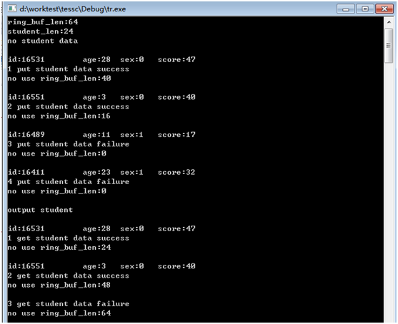 我们建立一个环形缓冲区,里面只有64字节大小(虽然我们实际使用时大小远大于此),向里面多次存入24字节student_info,看有什么反应