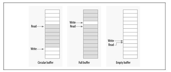 如图所示,当读者和写者指针相等时,表明缓冲区是空的,而只要写入指针在读取指针后面时,表明缓冲区已满。