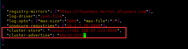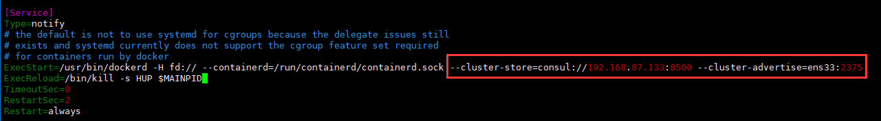 ExecStart=字眼,在此行末尾添加如下代码--cluster-store=consul://192.168.87.133:8500 --cluster-advertise=ens33:2375效果如下: